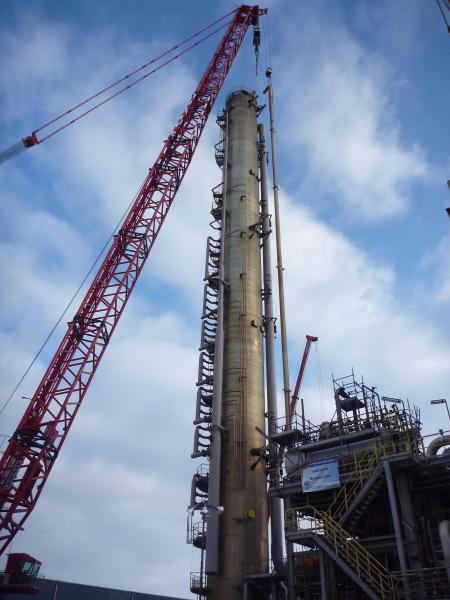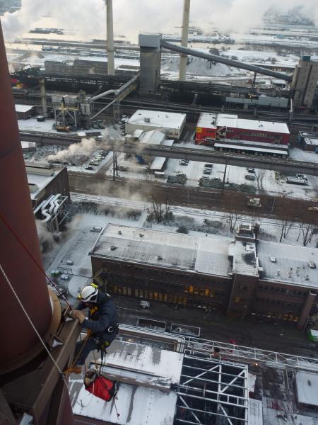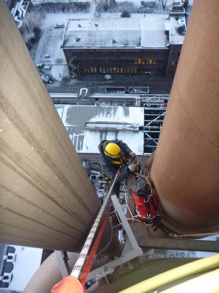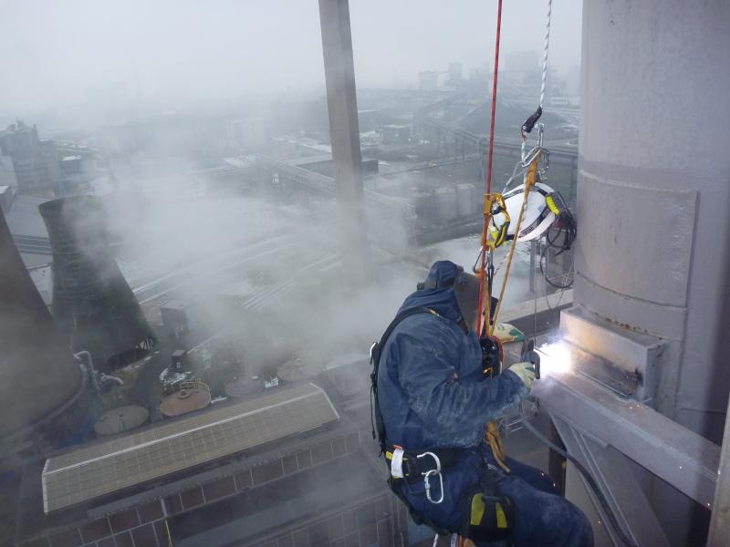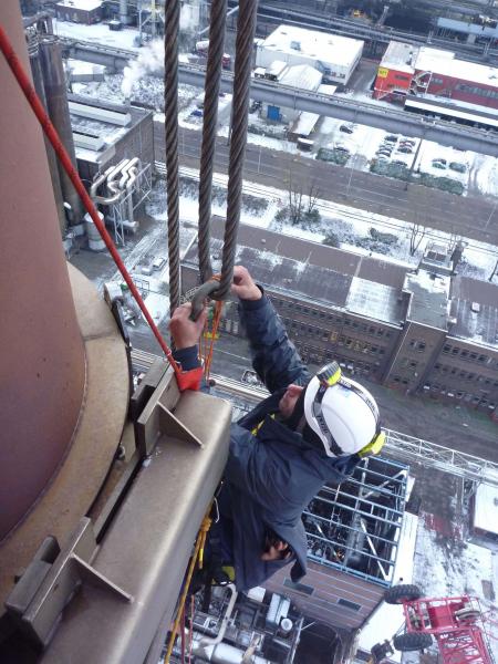 The Rope Access Group was requested to assist in the rigging and lifting operations of a tailgas pipe and a stack pipe, after we had originally done NDT inspections of the same areas. On both pipes, the supports were loosened and temporary lifting eyes were added before the rigging was installed.