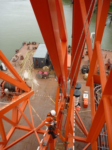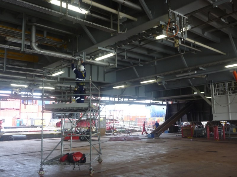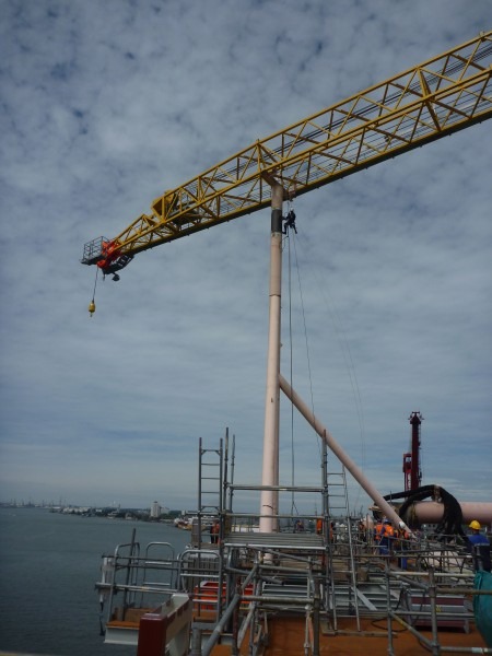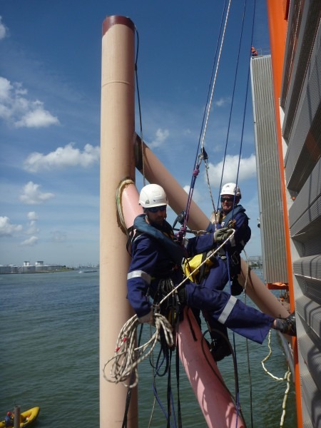 In the final stage scaffolds are taking away from the different decks. From that moment on every place that is difficult to reach, needs to be reached by means of rope access.
