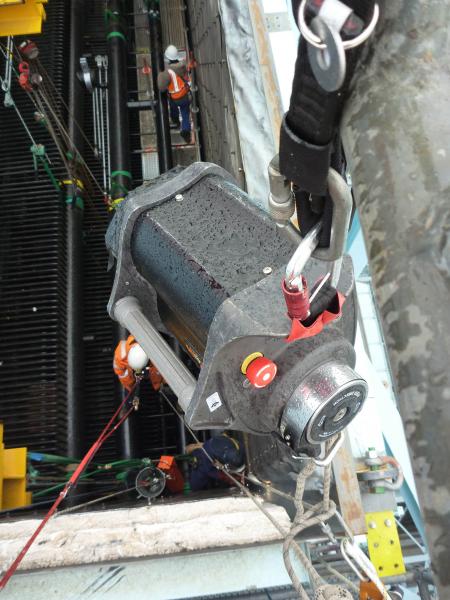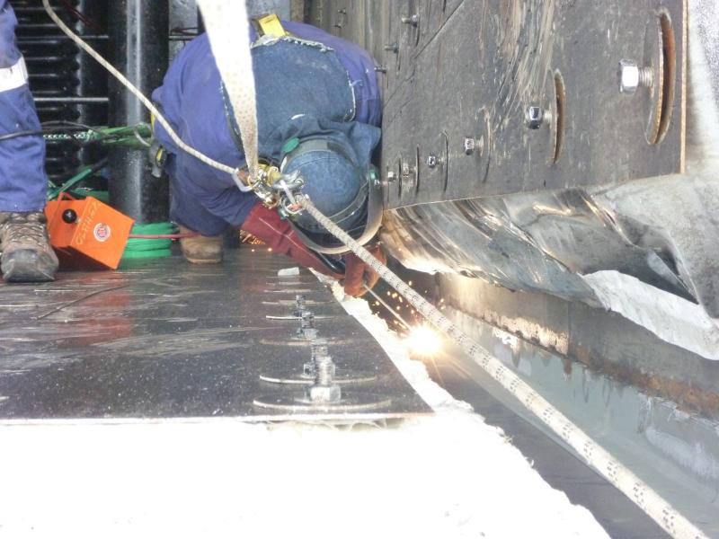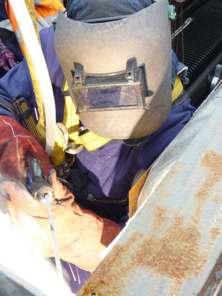 Voor het goed bereikbaar maken van de hoeken werd erboven een steigertje gebouwd met hijsinrichting. Om het de lasser gemakkelijker te maken, hebben we gebruik gemaakt van onze elektrische winch. Hierdoor is het positioneren voor de lasser zelf een stuk comfortabeler en minder energierovend. Hij hoeft dus zelf niets te doen en kan op de cm gepositioneerd worden. Erg lekker voor de juiste houding van de lasser.