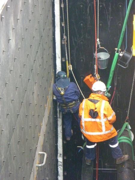 Tijdens het lassen vanuit de touwen wordt er altijd een 2e man naast de lasser ‘gehangen’ om hem te assisteren maar vooral om er voor te zorgen dat tijdens het lassen ook de veiligheid prioriteit blijft.
