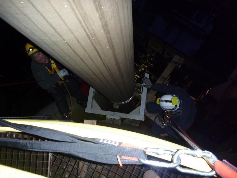 De verhuisde kolommen, pijpen en vaten werden op de nieuwe locatie weer opgebouwd. Rope Access Group BV was ook hierbij weer aanwezig om de hijswerkzaamheden vanuit de touwen te begeleiden en het vast maken van de supports.