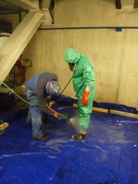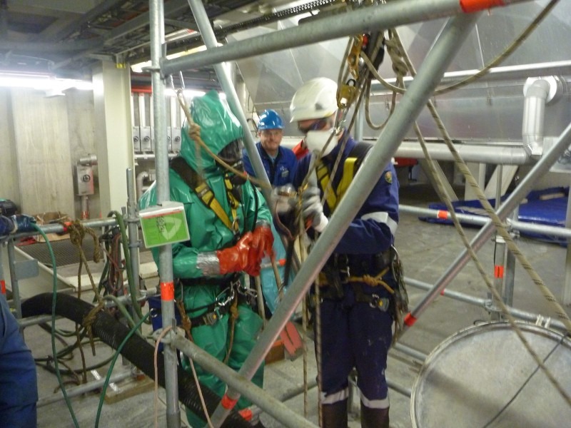 De enige veilige manier was rope access. Na uitgebreid vooronderzoek mbt het produkt, veiligheidsplannen etc en maatregelen als ademlucht en speciale zuurbestendige pakken kon worden afgedaald. Het belangrijkste was perfecte persoonlijke bescherming en er voor zorgen dat er geen vocht in aanraking kwam met rope access materiaal. Na vooronderzoek bleek dat de droge kalk geen negatieve uitwerking heeft op het rope access materiaal. Pas bij vochtigheid treedt de bijtende werking op. Desalnietemin werden extra back-up lijnen gebruikt en dagelijks vernieuwd.