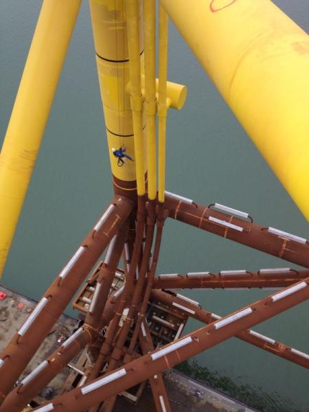 Dit was een typische last-minute rope access klus. Net voor het vertrek van de jacket naar zee bepaalde de klant van onze opdrachtgever dat er op verschillende plekken meer laagdikte op verschillende plekken opgebracht moest worden.