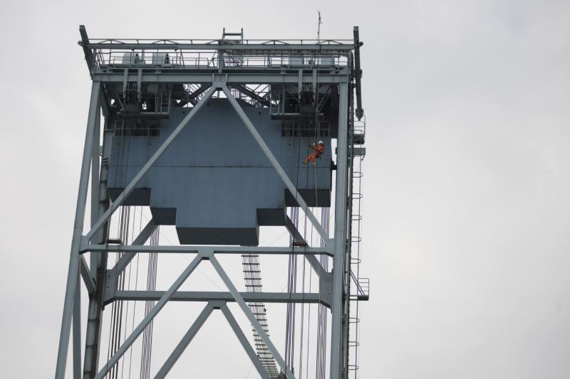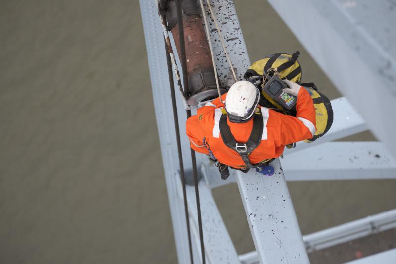 Op een brug in de Botlek werden wanddiktemetingen uitgevoerd op de kabelrolgeleiders.